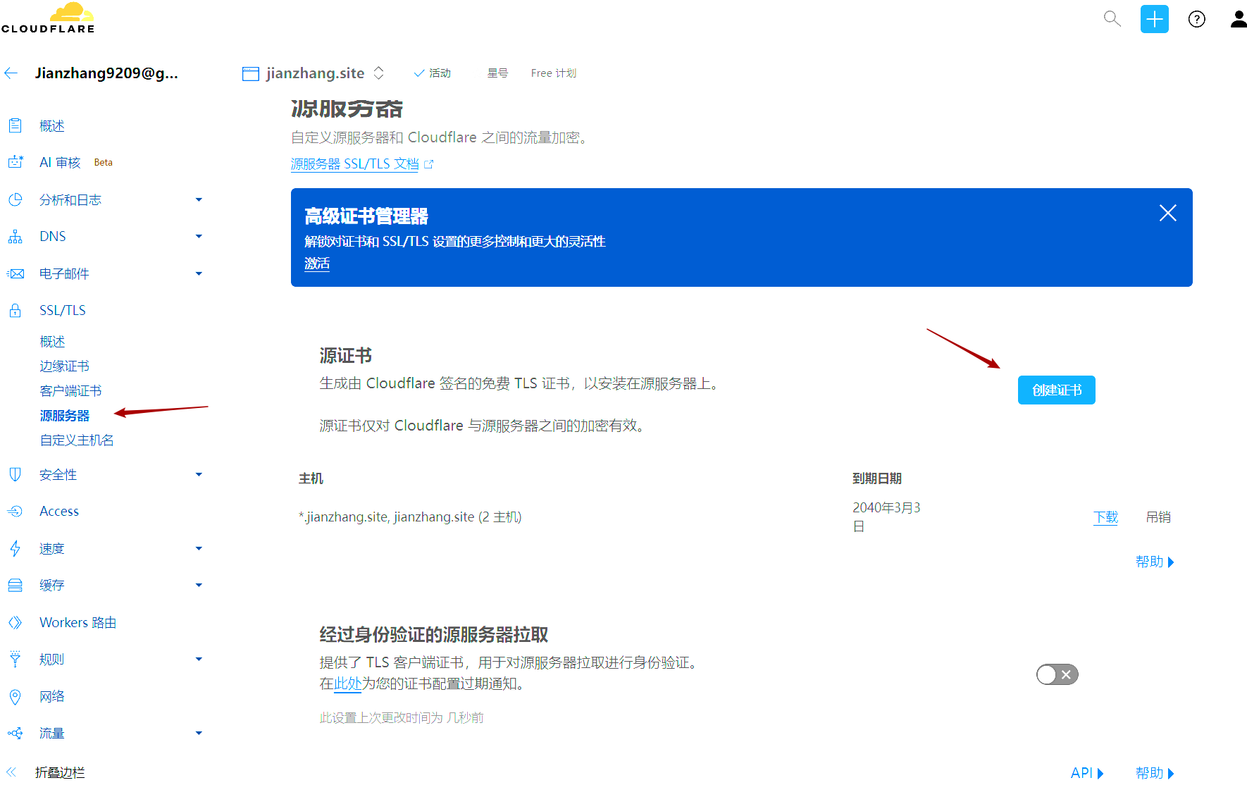 在“源服务器”菜单下,点击“创建证书”