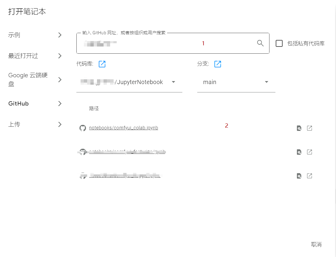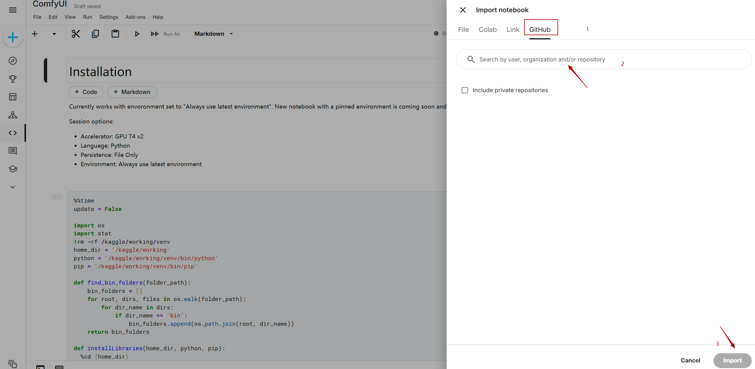 点击”File -> Import Notebook”,选择github,输入comfyui_kaggle.ipynb地址,点击导入即可新建一个笔记本。 该笔记本大致流程: