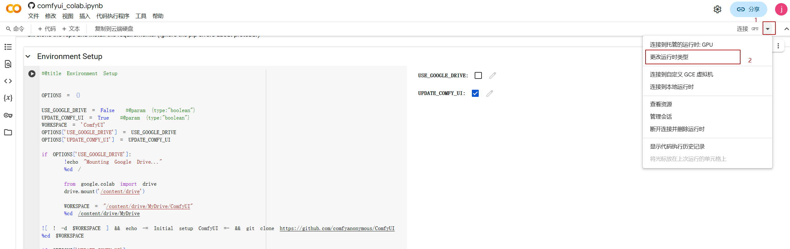 在笔记本中,你可以添加代码单元和文本单元。输入代码后,点击单元左侧的运行按钮或使用快捷键(Shift+Enter)来执行代码。 ipynb文件可以参照此文件comfyui_colab.ipynb,大致流程: