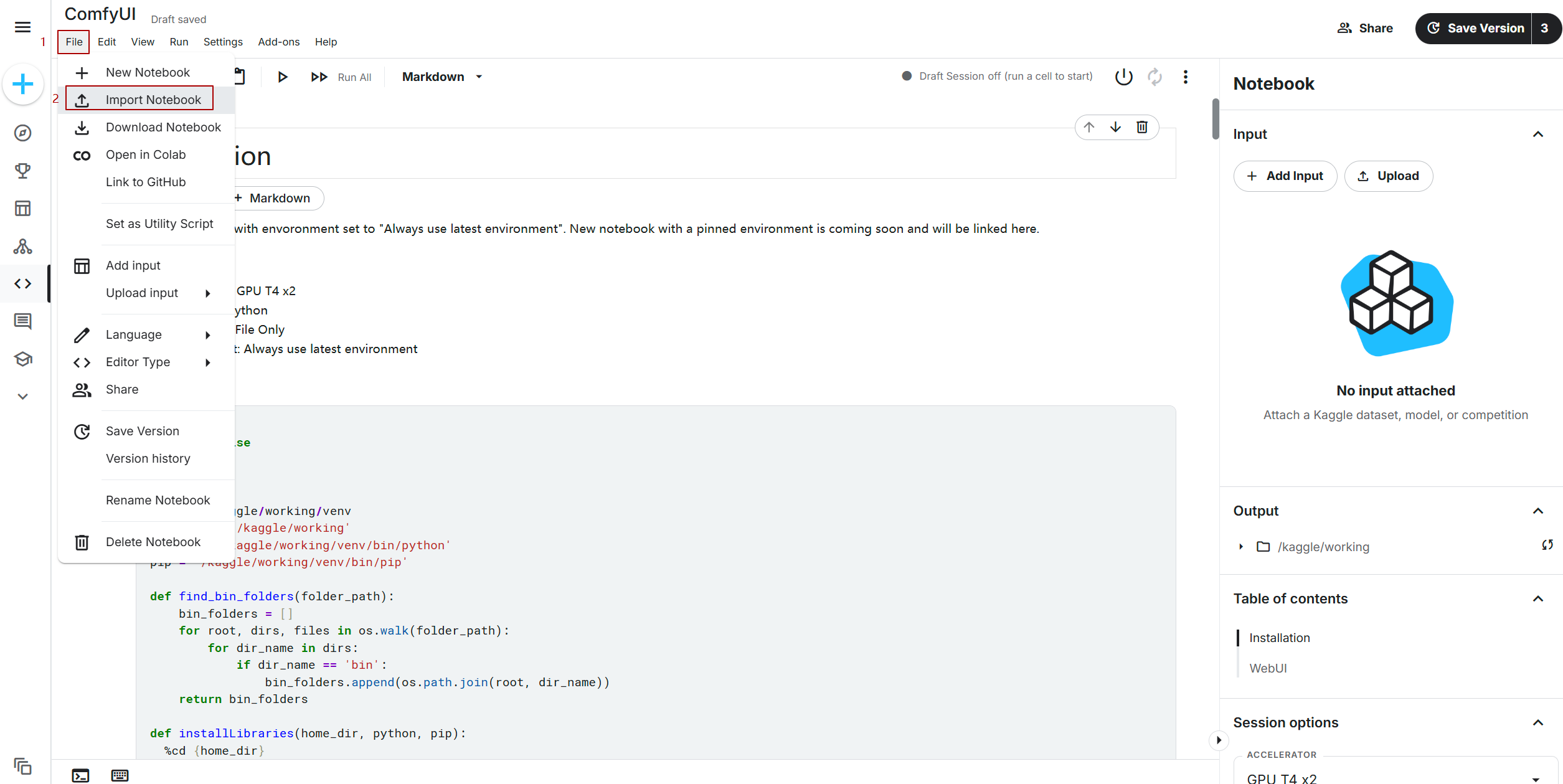 点击”File -> Import Notebook”,选择github,输入comfyui_kaggle.ipynb地址,点击导入即可新建一个笔记本。 该笔记本大致流程: