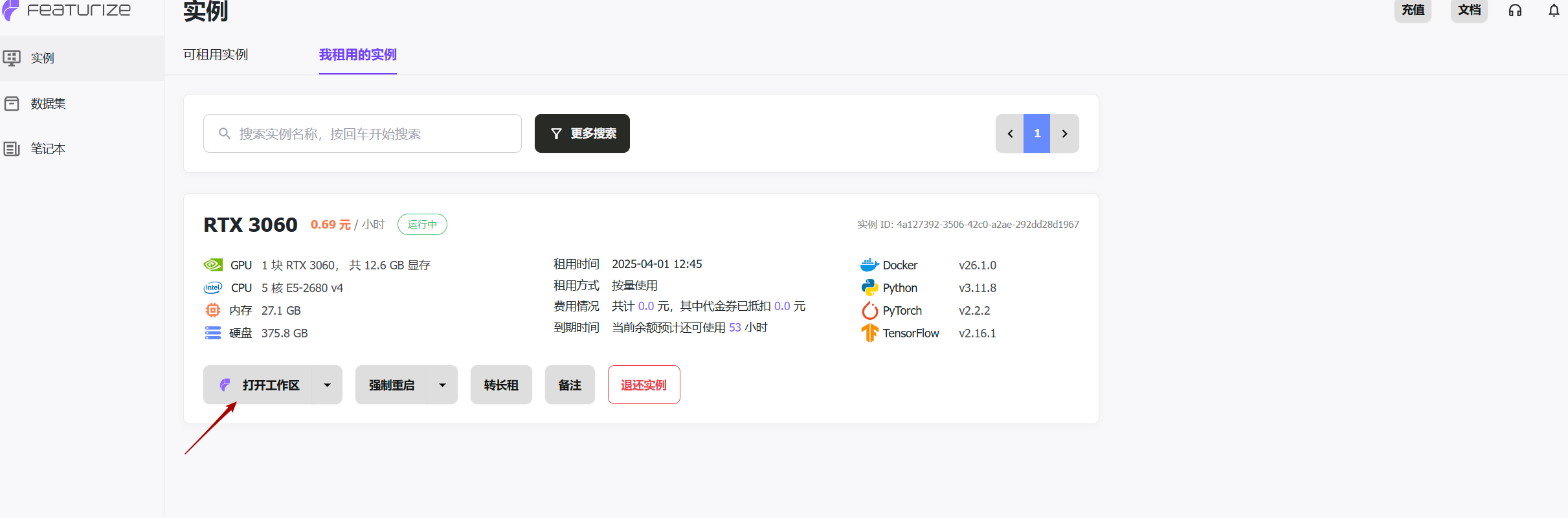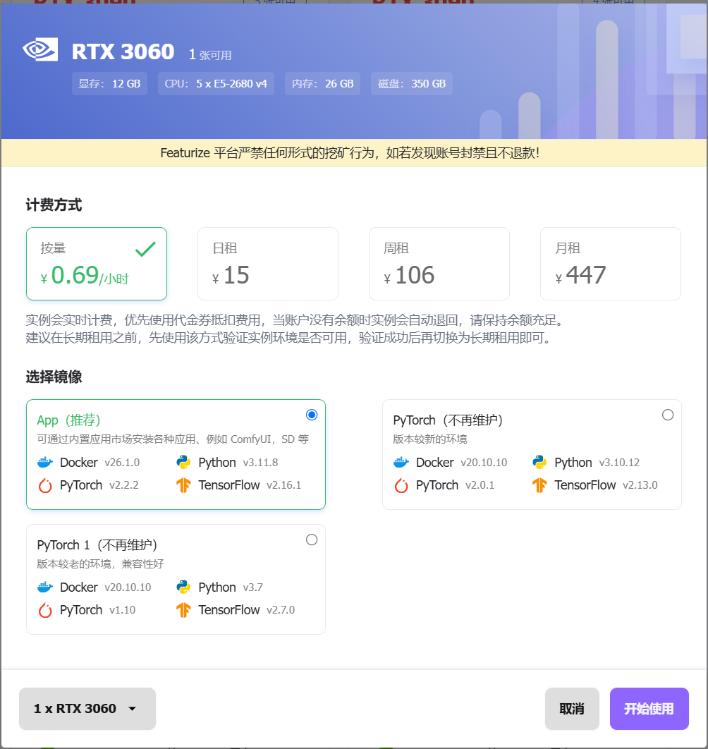 访问featurize网站并注册登录,筛选实例类型为GPU,选择想要租用的服务器并点击开始使用。